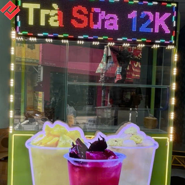 - Thu hút tầm nhìn từ xa: Với độ sáng cao và màu sắc sống động (lên đến hàng triệu màu), bảng LED đảm bảo xe trà sữa của bạn nổi bật trong mọi điều kiện ánh sáng và khoảng cách.